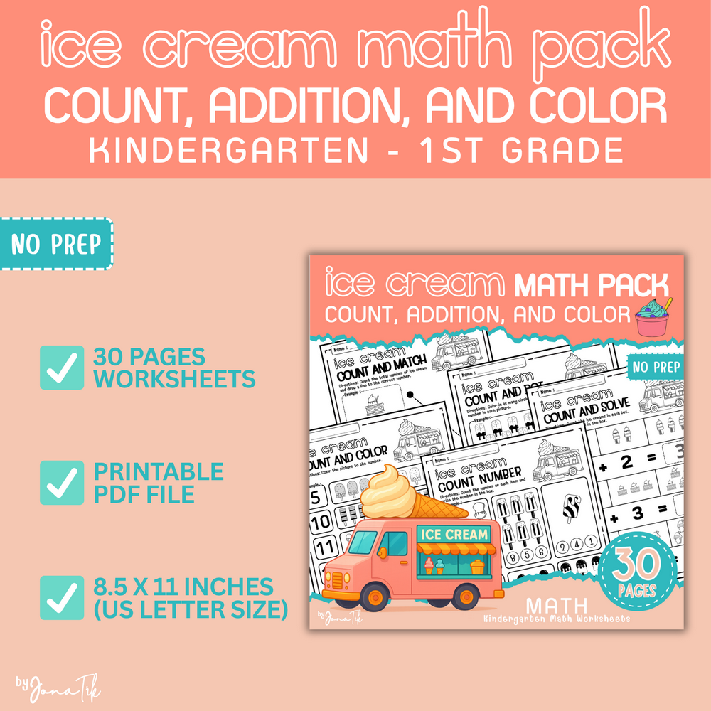This fun and engaging Ice Cream Math Pack is perfect for summer-themed math review, practice, or early finishers. With 30 printable pages, students will enjoy counting, matching, coloring, graphing, and solving simple addition in a playful way!